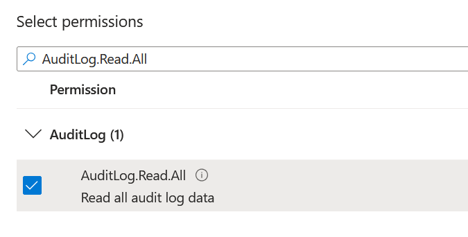 8. (Optional step to collect AZUser.LastSuccessfulSignInDateTime) Search for the AuditLog.Read.All permission and check the box next to it.