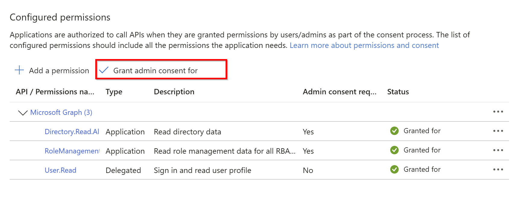 1. After being redirected to API Permissions again, you should see both permissions as Granted.