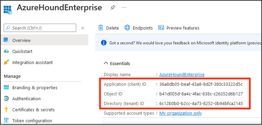 4. In the Overview menu, copy the Application (client) ID and Directory (tenant) ID to be used later in AzureHound Enterprise Local Configuration.