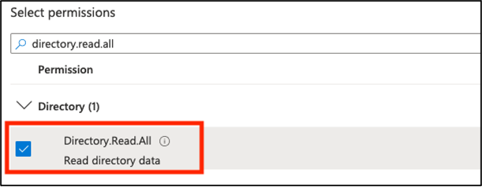 6. Search for the Directory.Read.All permission and check the box next to it.