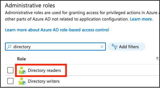 1. Search for the role Directory Readers and click the role name or description. Note: Clicking the checkbox sometimes prevents clicking on the role itself.