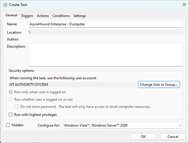 1. Best practices recommend naming tasks after their collector service and tenant to ensure clarity when reviewing multiple tasks across multiple collectors and/or tenants. In this example, AzureHound Enterprise is the collector, and the tenant referenced is Dumpster. In the Security options in the lower portion of the General tab, select the Change User or Group… button to run this task as SYSTEM. This ensures the scheduled task remains independent from user activity.