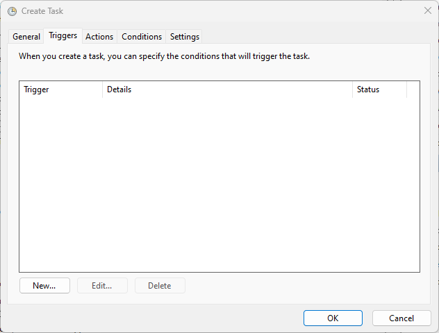 1. On the bottom of the Conditions tab, check the Start only if the following network connection is available: checkbox, and select Any connection.