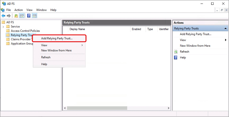 1. In the AD FS management console, right-click on Relaying Party Trust and click “Add Relaying Party Trust”.