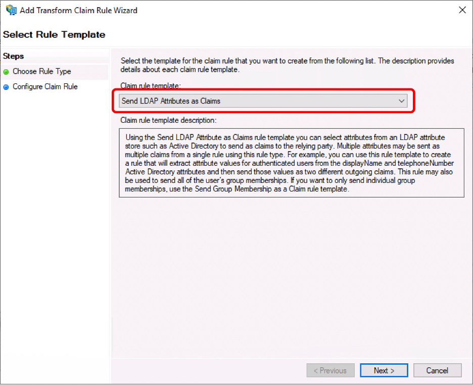 1. Choose “Send LDAP Attributes as Claims” and click “Next.