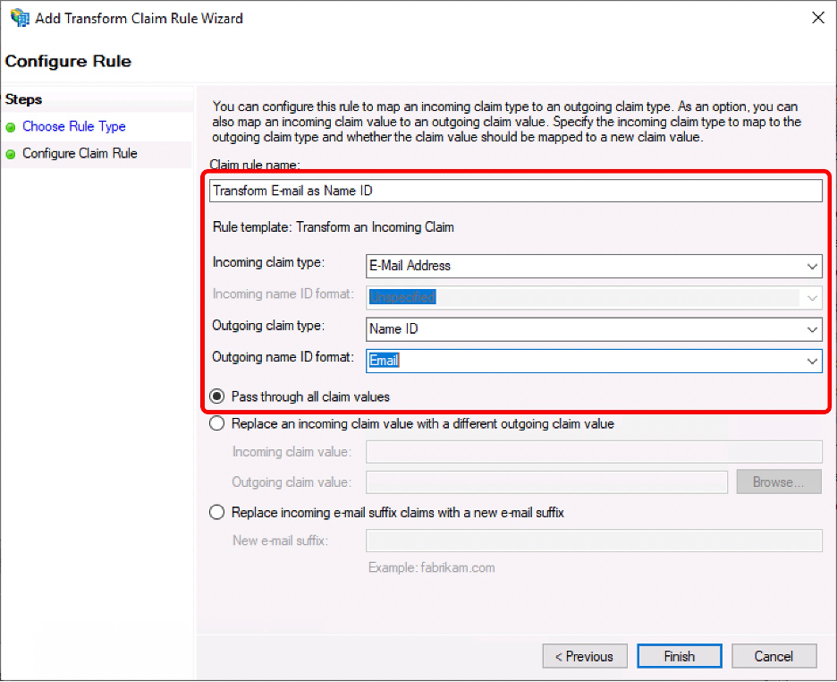 1. Fill out the following and click “Finish”. Incoming claim type: E-Mail Address Outgoing claim type: Name ID Outgoing name ID format: Email Choose “Pass through all claim values”