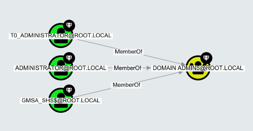 Applies to BloodHound Enterprise and CE For example, the image below shows three User nodes (left side) connected to one Group node (right side), via the “MemberOf” edge, indicating the three users belong to the group: