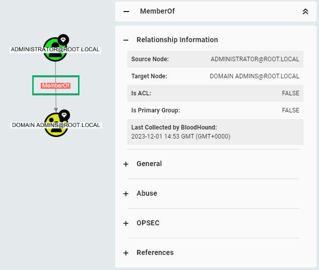 The direction of the edge, indicated by the arrow, always indicates the direction of attack or privilege. From the above example, because all three users have a “MemberOf” edge pointing towards the group, all three users have the same privileges as the group. Clicking on an Edge’s name/label in the graph shows its properties in the Entity Panel: